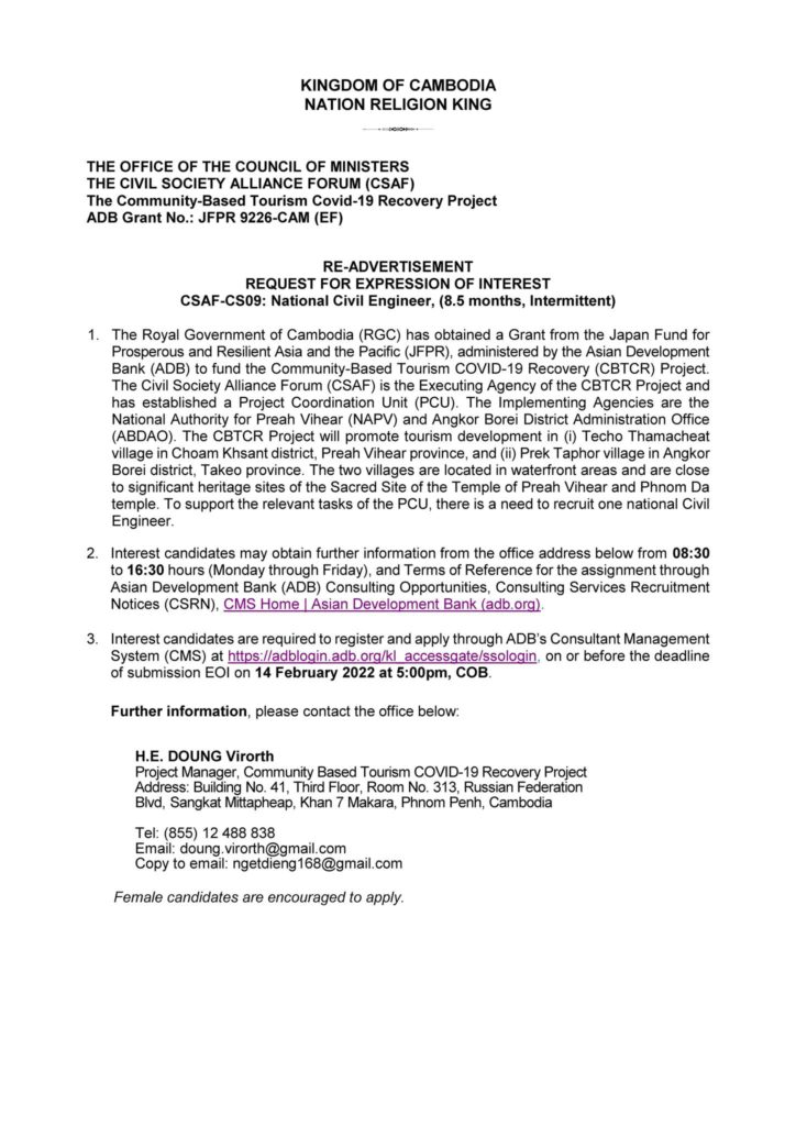 វេទិកាសម្ព័ន្ធសង្គមស៊ីវិល ជាអង្គភាពចំណុះទីស្តីការគណៈរដ្ឋមន្ត្រី និងជាអង្គភាពអនុវត្តគម្រោង (EA) សម្រាប់គម្រោងស្តារវិស័យទេសចរណ៍សហគមន៍បន្ទាប់ពីវិបត្តិកូវីដ-១៩ រវាងរាជរដ្ឋាភិបាល និងធនាគារអភិវឌ្ឍន៍អាស៊ី (ADB) ដែលមានទីតាំងនៅអគារទីស្តីការគណៈរដ្ឋមន្ត្រី លេខ៤១ ជាន់ទី៣ បន្ទប់លេខ៣១៣ ផ្លូវសហព័ន្ធរុស្ស៊ី សង្កាត់មិត្តភាព ខណ្ឌ៧មករា រាជធានីភ្នំពេញ សូមជូនដំណឹងអំពីការជ្រើសរើសវិស្វករស៊ីវិលជាតិ (National Civil Engineer) ចំនួន ១រូប ដូចមានខ្លឹមសារក្នុងឯកសារខាងក្រោម ឬទាញយកឯកសារតាមតំណភ្ជាប់ https://bit.ly/40opTwT នេះ។