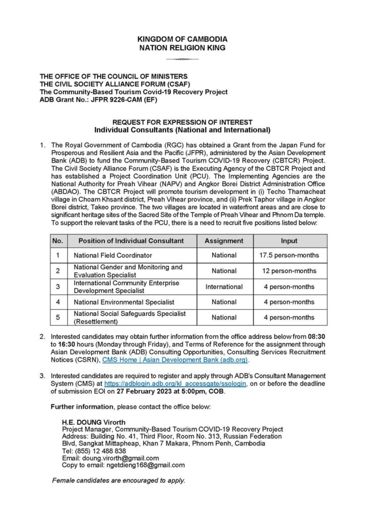 The Civil Society Forum (CSF) is a unit under the Office of the Council of Ministers and an EA (Project Implementation Unit) for the Community-Based Tourism Rehabilitation Project after the Kovid-19 Crisis between the Royal Government and the Bank. Asian Development Bank (ADB), located at the Office of the Council of Ministers No. 41, 3rd Floor, Room 313, Russian Federation Road, Sangkat Mittapheap, Khan 7 Makara, Phnom Penh A photo and a foreign professional officer as shown in the document below. Closing date for applications is February 27, 2023 at 5:00 PM.