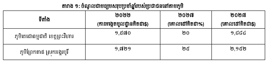 ប្រាក់ចំណូលសរុបប្រចាំឆ្នាំជាមធ្យមរបស់គ្រួសារនឹងកើនឡើង២០% នៅក្នុងភូមិតេជោធម្មជាតិ និង២៥% នៅភូមិព្រែកតាភោ។ ការស្ទង់មតិ (baseline survey)លើប្រាក់ចំណូលសរុបគ្រួសារប្រចាំឆ្នាំរបស់ភូមិនានា នៅក្នុងភូមិតេជោធម្មជាតិក្នុងឆ្នាំ ២០២០ មានចំនួន ១.៥៧០ ដុល្លារ និងនៅភូមិព្រែកតាផ ស្រុកអង្គរបូរី ចំនួន ១.៧២១ ដុល្លារ។ ការកើនឡើង២០% នៅក្នុងភូមិតេជោធម្មជាតិ នឹងមានចំនួន ៣១៤ដុល្លារនៅឆ្នាំ២០២៧ ដូច្នេះប្រាក់ចំណូលសរុបគ្រួសារប្រចាំឆ្នាំរបស់អ្នកភូមិនឹងមានចំនួន ១,៨៨៤ដុល្លារ ខណៈដែលការកើនឡើង២៥% នៅក្នុងភូមិព្រែកតាផនឹងមានចំនួន៤៣០ ដុល្លារនៅឆ្នាំ២០២៧ ដូច្នេះប្រាក់ចំណូលសរុបគ្រួសារប្រចាំឆ្នាំសរុបរបស់អ្នកភូមិនឹងមានចំនួន ២ ១៥២ ដុល្លារ។