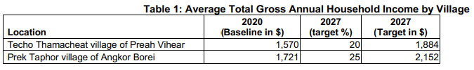 The average total gross annual household income will increase by 20% in Techo Thamacheat village and by 25% in Prek Taphor village. The baseline survey on total gross annual household income of the villages in Techo Thamacheat village in 2020 is $1,570 and in Prek Taphor village of Angkor Borei is $1,721. The increase of 20% in Techo Thamacheat village will be $314 by 2027 therefore the total gross annual household income of the villagers will be $1,884 while the increase 25% in Prek Taphor village will be $430 by 2027 therefore the total gross annual household income of the villagers will be